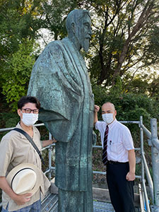 - 安田女子大学の竹本知行先生と大阪観光大学の久野潤先生を岡公園の「陸奥宗光先生乃像」に案内しました。故郷の偉人を案内、紹介できることは誇りになります。
