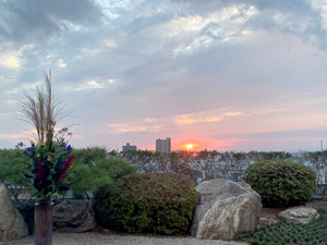 和歌山文化協会主催の「観月の夕べ」に参加しました。華道部と茶道部から中秋の名月に献華と献茶の行事を行い、月見を楽しむ機会となりました。ただ献華と献茶は西の空に向かってのため、背景には赤く染まった夕日が輝いていました。太陽と月の物語を堪能する「観月の夕べ」を楽しむことが出来ました。